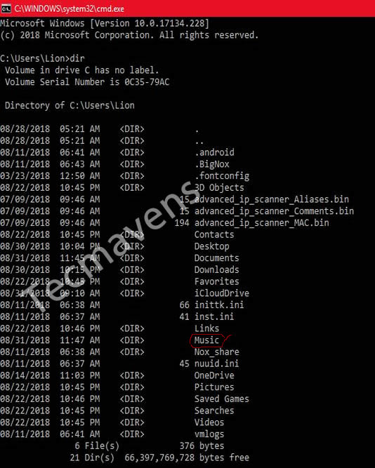 Step 2: Since the folder we want to hide is in Music folder, we need to change directory to Music folder by typing “cd music” and pressing enter as shown below. When it changes to music folder, type “dir” and press “enter” to display music directory (list of files & folders in “Music”) as shown below.